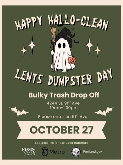 We will host a Dumpster Day at 4244 SE 91st Ave on October 27th from 10am-1:30pm where neighbors can pull right up and unload bulky items that may be too expensive to take to the transfer center.